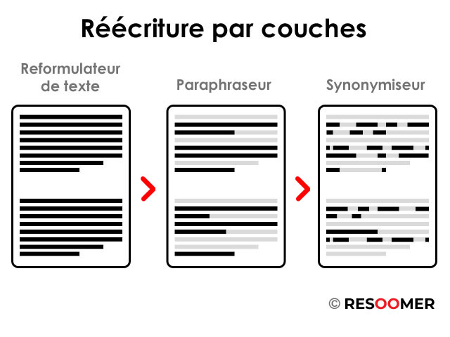 Reformulateur (registre au choix) → réécriture globale dans une nouvelle forme → Paraphraseur sur les passages clés → affinement phrase par phrase → Synonymiseur → enrichissement lexical mot par mot → Correcteur → Éditeur → Export PDF ou Doc
